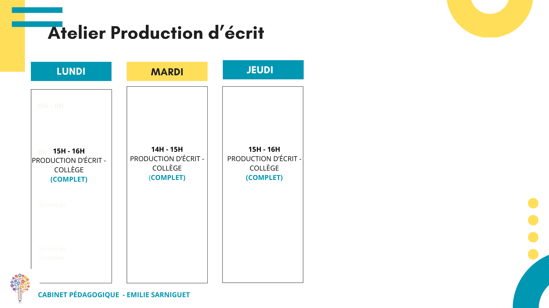 En ce moment, 2 ateliers ponctuels primaire et un atelier ponctuel collège ont lieu le mercredi.