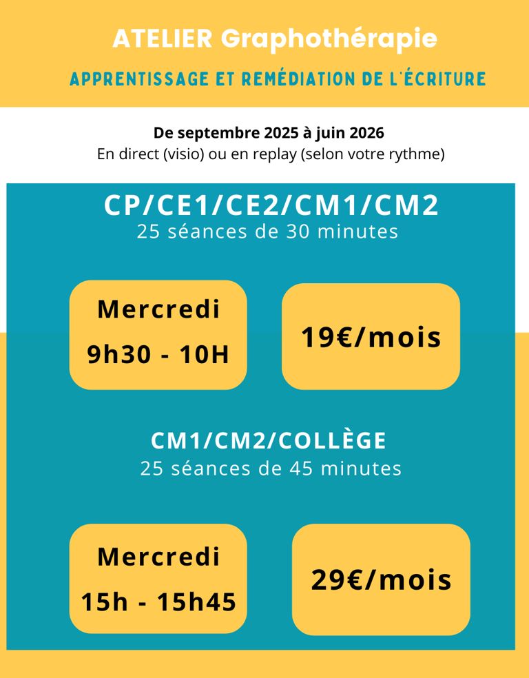 Les ateliers collectifs de graphothérapie se déroulent chaque semaine en visioconférence, via Zoom, en petits groupes de 4 à 6 enfants. Ces séances offrent un cadre bienveillant et motivant pour améliorer l’écriture tout en renforçant la confiance en soi.
