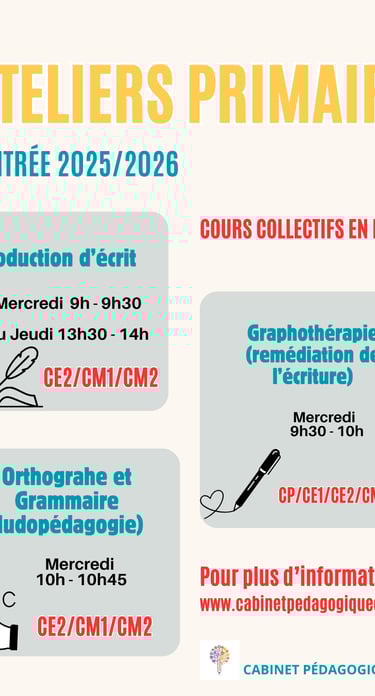 SOUTIEN SCOLAIREATELIERS COLLECTIFSORTHOGRAPHEGRAPHOTHÉRAPIEGRAMMAIREPRIMAIRE