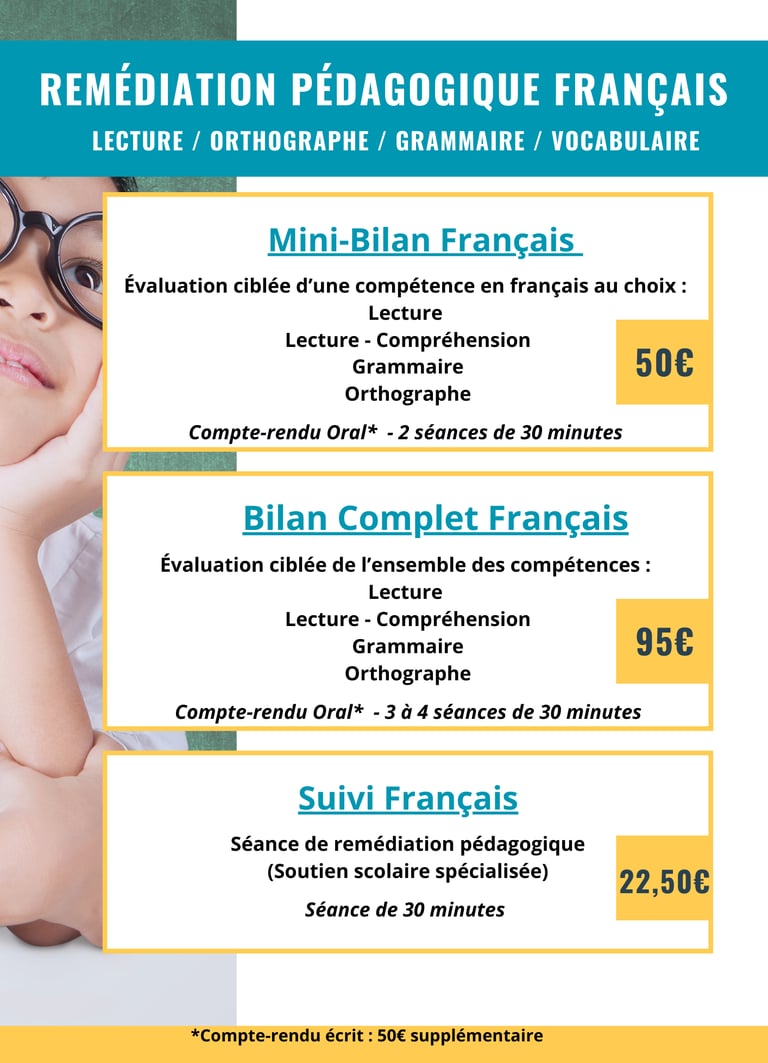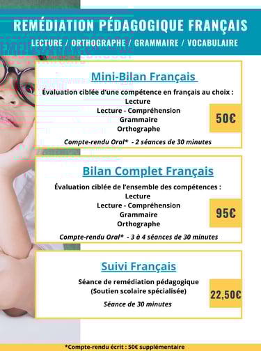 En premier lieu, nous réalisons un bilan pédagogique complet incluant une anamnèse détaillée ainsi qu’une évaluation diagnostique spécifique en orthographe/grammaire.
